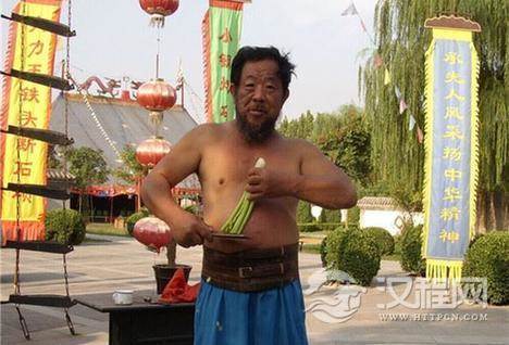 第二怪:高福洲白菜肚皮切青菜。高福洲18岁时曾创1小时劈破300块砖纪录,人送绰号“小钢炮”。