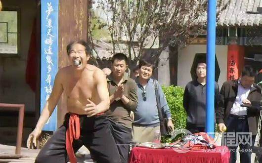 比方说,保定张和群表演的“吞剑挂重物”,双脚踩在锋利的刀刃上,口中吞下一根六七公分长的钢剑,剑柄上再挂一个26公斤斤重的女孩儿。