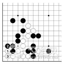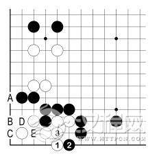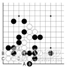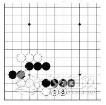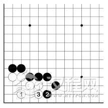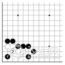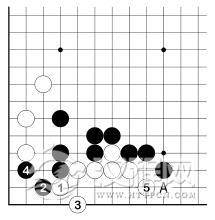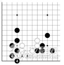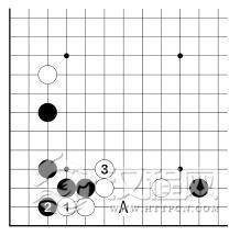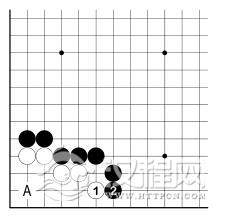 白 2、黑 3 之后,白虽有 A 位跳入角上,但仍眼位不足。