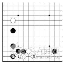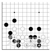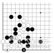 白 1、3 勉强活了。黑 4 当然吃住左边白二子。不论这是不是不得了的损失,因为 3 图的扳虎没有问题,所以应选择 3 图的下法。