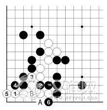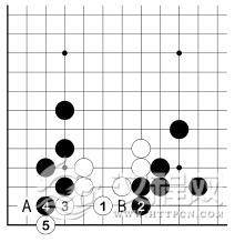 黑 1 点,白 2 顶,黑 3 跳后,5 位再挡,白棋麻烦了。接下来,白 A、黑 B,白全死。