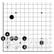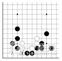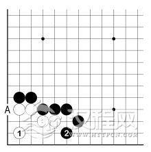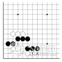 在 1 图中,白 1、3 扳粘欠考虑。其实白必须 1、3 扳虎。至白 5 尖,黑 A 再挡时,白脱先也活了。可见其差别是很大的。