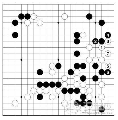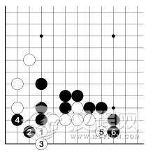 续前图。局部看,黑有 1 点的手段,但白 2、4 后更有 6 挖的有效手段。
