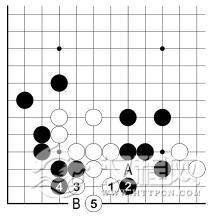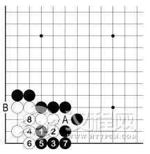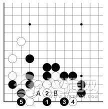 这是一个以后要懊悔的例子。上面白棋已被围住,而且是薄形。黑 1、白 2 后,请注意对角上白棋,黑 3 是先手,白 4 如不补,被黑 4 卡,结果白 A、黑 B,角上白棋净死。