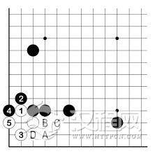 黑 4、白 5。黑 4 若 A 跳,则白 B、黑 C、白 D,白棋活了。