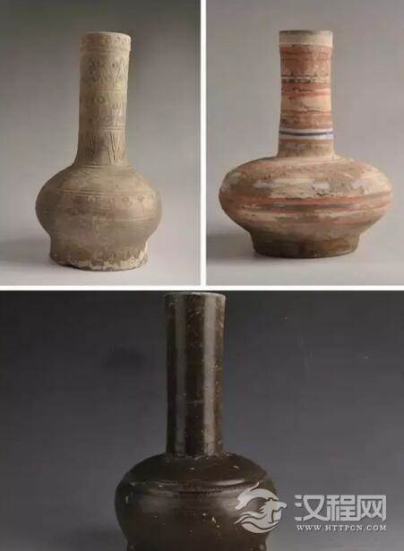 左上: 汉 鹤纹刻划投壶 右上:汉 彩绘投壶 下:汉 绿釉三足投壶