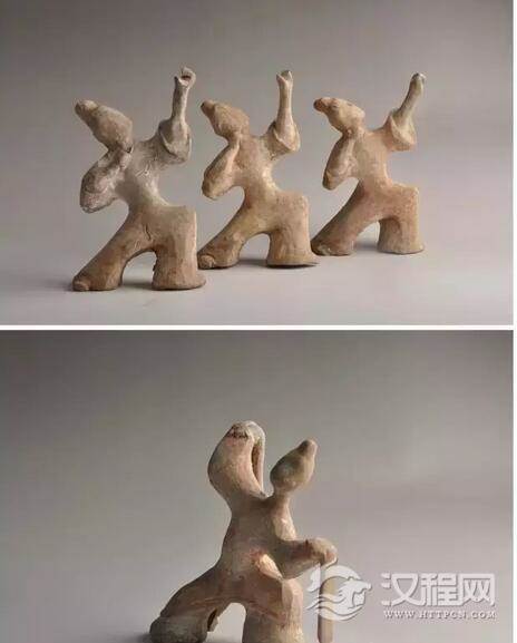 上:汉 彩绘陶建鼓舞俑 下:汉 彩绘陶盘鼓舞俑
