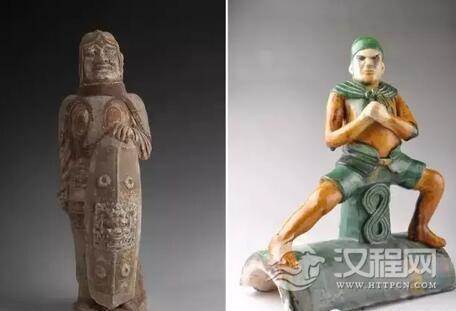 左:北齐 镇墓武士俑 右:明 黄绿釉瓦将军