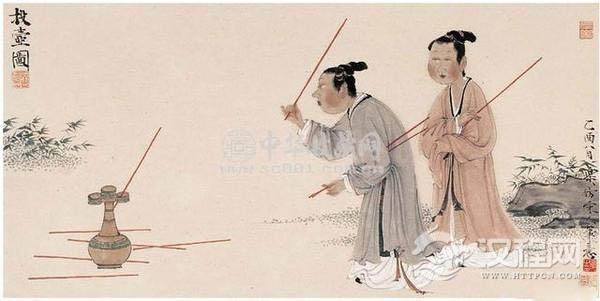 投壶,亦称射壶,是一种既登大雅之堂又入巷陌平民家的传统游戏。在明清小说中,社会底层的三教九流都玩此道。《镜花缘》里的那位“乌投壶”,能玩出“苏秦背剑”、“鹞子翻身”、“朝天一炷香”、“张果老倒骑驴”等许多投壶花样,可见这种游戏在民间的普及程度。