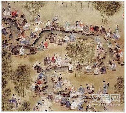 纵观中国历史会发现,世俗欢乐在民生中的比重与日俱增,而近古以前的庄重虔诚同宗教色彩一并淡去,并且逐渐演变成了水边宴饮赋诗的风雅活动。“曲水流觞”作为主角逐渐登上舞台,尤为文人雅士所好。“曲水流觞”,又名“九曲流觞”,觞就是杯,即投杯于水的上游,任其流下,停止在哪里,那么正坐在旁边的人就要端起酒来喝光,同时赋诗一首。觞一般是由角质或木质等轻材料制成,因此可以浮于水上;另有一种陶制的杯,两边有耳,称为“羽觞”,“羽觞”比木杯重,玩时则需要放在荷叶或木托盘上。