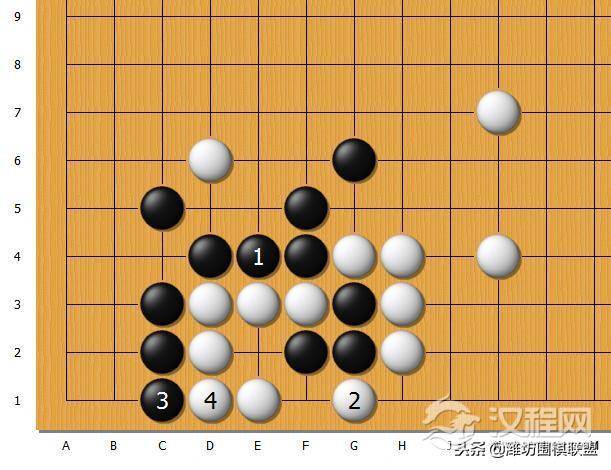 图四:假如白2抵抗,黑3紧气,白棋不入气,反被黑棋吃掉。