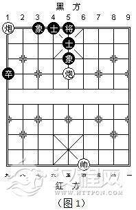 一般情况下,双炮对士象全是和棋。如图1,红方构成天地炮,红帅控制黑方将门,有了巧胜的机会。黑方惟一可动之子就是边路卒。双炮捉掉边卒轻而易举,但是红方中炮移开中路后,黑方将会调整士象,之后红方将很难再全面控制黑将和双士双象的运转,从而成为和棋。如何在控制中路和黑方将门前提下,把黑卒捉住,是这盘棋的关键。明确了条件和目标,下面就是技巧问题了。让我们一同看红帅和双炮是如何巧妙配合、精彩捉兵的。