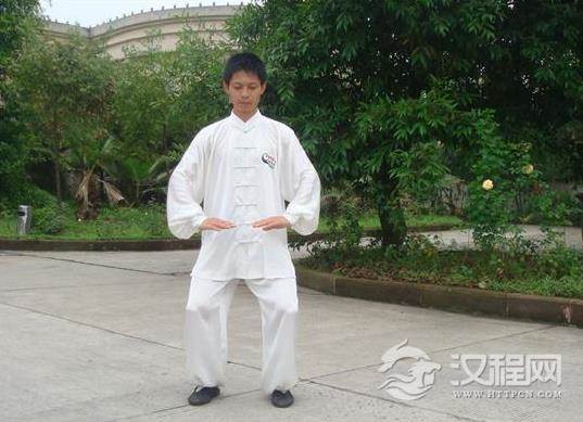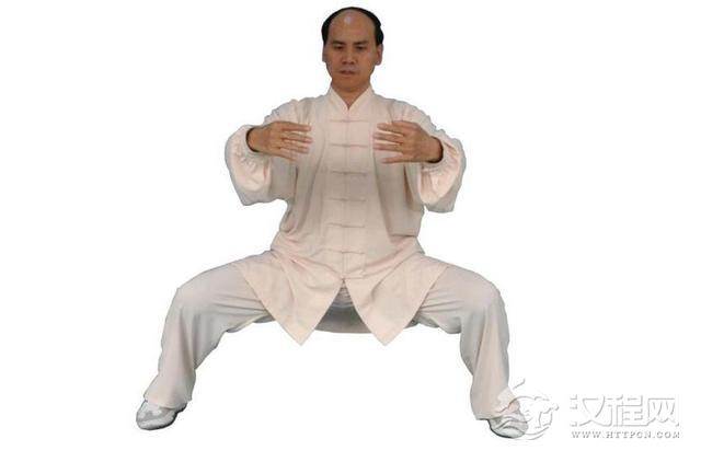 脚与肩同宽下蹲,要点是会阴向下蹲,头顶百会向上拉,向上顶,背脊骨用力二头拉,可迅速打通中脉。还有一个重点是脚板用力向下踩,此即武家内练口诀:“力从地下生。”同时也是医家治病的妙诀,因为站桩时脚板涌泉用力向下踩可以迫体内的病气,寒湿热邪气从涌泉迫出体外。