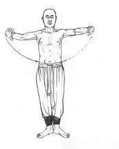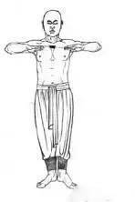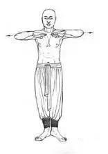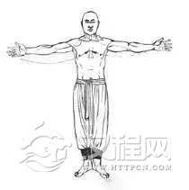1.两手成掌向左右平直展臂,虎口向上,指尖向外。(图4)