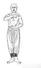 2.两脚尖外摆,呈“八”字形分开两脚跟靠紧缓缓提离地面,用两脚前掌着地支撑;两掌上收于胸前,左掌掌心向上,右手握拳放于左掌上,拳心向上两膝直立,脊梁直竖,端头正项。双目下视,闭唇合齿,舌抵上腭,以鼻自然呼吸。(图2)