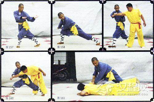 技击:彼用右拳顺式击我中上盘,我身体右转退右步,两手上下合抱其臂(图159),两手用力拉其臂于右下方,同时,左脚向后瞪蹋绊其腿(图160、161)。