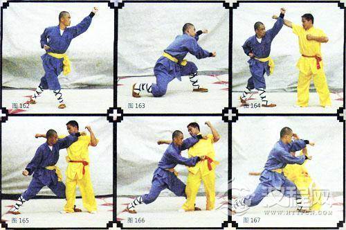 技击:彼右拳击我上盘,我左拳向上探出,化解其力(图164),随即,上左脚扣其前腿,同时,两臂击其面部和腹部,使其仰面倒地(图165、166、167)。