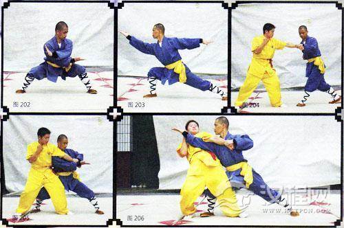 技击:彼用顺式右拳击我中上盘,我左手向外抓握其腕(图204),上右脚扣其左腿,左手回带,右手插掌于左臂下方(图205),成弓步,右臂和右膀靠击其胸部,使其仰身后倒(图206)。