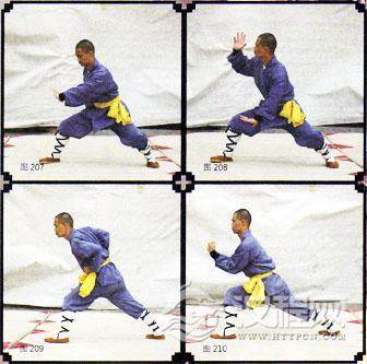 单练:上右脚成弓步,左手成立掌向外拨挡,右手抱拳于腰间(图207),左手变拳回拉至肩前,在拳变掌由腰间向左下方推击,与腰平行,左脚上步直腿脚尖离地上勾(图208)。