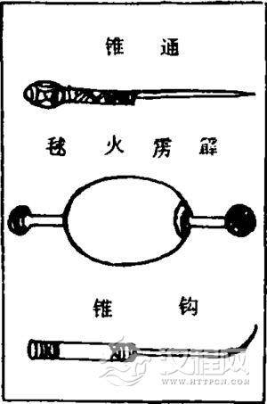 《武经总要》记有八种:引火球、蒺藜火球、霹雳火球(见图16)、烟球、毒药烟球、火球、铁嘴火鹞、竹火鹞等。前六种一般是先把制好的火药,同铁片等杀伤或致毒物拌和,然后用多层纸糊固成球形硬壳,壳外涂上易燃的引火之物,晒干后使用。使用时,先用烧红的烙锥将球壳烙透,然后将小的用手投掷,大的用抛通 锥石机抛射。当火球抛射至敌方后,燃着的球壳将球内的火药引燃发火,达到作战目的。铁嘴火鹞用薄板制成鹞身,头部安有铁嘴,尾部绑有秆草,火药装于尾中。竹火鹞用竹片制成灯笼形外壳,壳外糊纸数层,内装火药一斤,尾部绑草三五斤。使用时,先点着尾草或鹞身内火药,尔后用抛石机抛至敌方进行燃烧。
