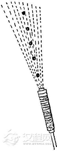 飞天喷筒(见图17)长一尺五寸,用直径二寸的竹筒制成,筒外用麻绳缠紧,尾端安一根长五尺的手柄。装填药料时,先装一层炭多硝少的慢燃烧火药,次装一层喷射火药,再装一枚用硝石、硫磺、雄黄、樟脑等易燃和致毒物制成的火药饼。药饼两边有通火渠槽,并将火药饼压实。然后再依次按同样方法装填五枚药饼。如果装药量适当,火药饼可喷射至数十丈远的敌船上,将敌船焚毁。