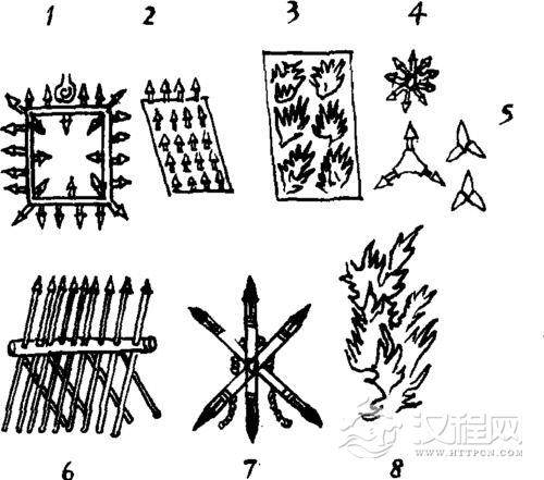 1扌刍蹄 2地涩 3陷马坑 4铁蒺藜 5铁菱角 6鹿角枪 7拒马木枪 8鹿角木