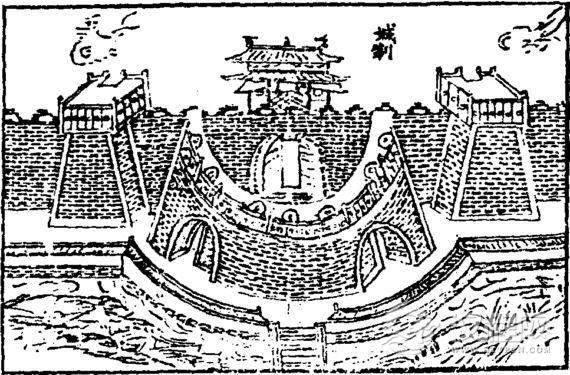 其八是壕桥。又称吊桥。平时作为城内外通过护城河的通道。战时可以悬空吊起或将其撤去,使攻城之敌难以通过护城河。