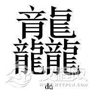 《汉语大字典》解释此字说:二龙、三龙均音dá,龙行貌。四龙音zhé,义为“唠唠叨叨,话多”,并认为四龙是“詟”的异体字。《说文言部》:“詟,一曰言不止也。”(据《咬文嚼字》)