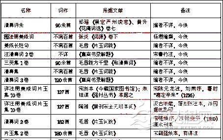 周邦彦词集的编辑和刻印,大致是在北宋末年至南宋初期。《宋史·艺文志》著录《清真集》11卷,《攻媿集》及《郡斋读书志》著录《清真先生文集》24卷,《直斋书录解题》著录《清真杂著》3卷,这三种周邦彦的著作今皆散佚不传。据宋人记载,以上三种周集中皆附有长短句的歌词作品在内,大概是后来编刻和流行的《清真词》的源头和祖本所在。今可考周词最早的别行单刻的专集之本,当为南宋绍兴年间出现的《清真诗余》。《景定严州续志》载州校书板“有《清真集》,复有《诗余》是也”。南宋黄升《花庵词选》即据此本选录周词。《清真诗余》今佚,收词若干首已不可详考,今人钱鸿瑛等据南宋黄升《花庵词选》所选清真词及方千里、杨泽民等所和清真词,推测约为90余首 ④ 。这大概是南宋以来所流行的各种“不满百阕”的周邦彦词集的另一祖本。此后,整个南宋时代各种版本的周邦彦词集大量编刻和流行,数量之多、流行之广、影响之大,在两宋词人中极为少见。据今人考证,整个南宋约有十数种周邦彦词集在流传。现列表如下: