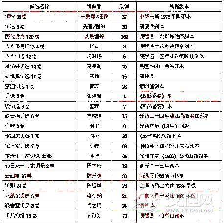 经历了元明两代的衰微期后,词在清代不仅重新焕发创作的活力,而且词学研究也极为兴盛,词籍的汇刻与校勘,词乐、词谱的整理研究,词话中词学理论的探讨等,其规模之大、成就之高均超越前代。清代词家众多,流派纷呈,各家各派往往通过编辑词选来标示风旨,借以创体构派。于是,清代词集选本不仅大量涌现,而且词选的功能也得到不断扩展,在传词存史的基础上进一步增强了理论色彩。周邦彦作为宋代词坛大家,在清代自然也得到了词选家们的特别关注和青睐。然而由于清代词派复杂,理论纷呈,也使得周邦彦词在清代通过选本的传播与接受,走过了一条跌宕起伏的道路。下面试取清代主要词选,列表加以考察分析: