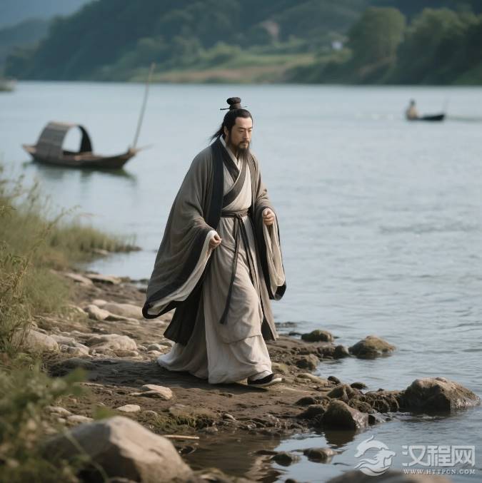 天微亮,屈原将诗卷收入怀中,缓步走向江边。