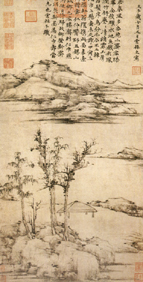 倪瓒出身富豪,作山水以“二岸一水式”构图见长,善用干笔皴擦,好作折带皴以见坡石的跌宕。他的作品不绘人物,简远平淡,具有超尘绝俗的韵味。如《渔庄秋霁图》,近处坡石上植数枝枯木,中景不着一笔,空阔平淡,是为湖水,远处山坡如带,境界萧疏,空旷中含有孤傲之气,被视作元画逸品的代表。