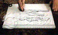 "指侧"是手指的边缘部分。指侧的位置在指尖的侧边起到第二节的侧边止,为可以利用作画的部位。指侧这个名词已告诉我们,主要的功能是侧锋。而侧锋又是作画应用最广泛的技法之一,手指画的侧锋,在作画上也就占有极其重要的地位。手指不能像笔锋那样压开、吸水,而只能依靠手指的指侧横倒,把线条扩大成块面。指侧,画出来的侧锋,不但坚实有力,其破损、飞白,极富天趣,特别在挫折、顺逆时更是运指灵活,如画山石之 法,极富石壁岩的质感。指侧作画,还有一个优点:指侧部位利用侧锋,可以画一米以上的长线条,扭转了某些人说"手指画不能画长线"的陈词。所以我们说:手指画不但能画长线,而且还画得非常流利。手指画的长线从表现的技法来看,大有"意到指不倒"的神韵。因此,手指画的侧锋是最有用的部位。