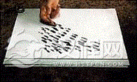 指背的部位在手指背部,自手指甲到第一、二、三节为止。使用的接触面比指侧大得多。在画大面积的 擦、染各处画法时。最适宜用指背作画。指背作画时,必须把手指背全部平贴于纸面,才能发挥指背的作用。指背在作手指画的技法中,是独具风格的。指背与指头正好是正反两面,可是作用却大不相同。指头是平滑的厚肉,又光又软,要画破锋就很困难,而指背却是高低不平的。指背的皮肤和指甲,有几个起伏,尤其指背是硬的,正是由于不平和坚硬的缘故,所以多用来表现自然的飞白和残缺的古拙感。用指背作画时,由于是仰手,因而,如果人站着作画,那么手自然下垂,以指背轻快地动作,就会显得十分自由,更为有利的是,仰手作画,掌心可以储更多的墨色和水,画的面也就更大了。指背作画还有一个特点是,指侧作画,只能一个手画,而用指背作画时,可以两个指背,三个指背,或四个指背合要,加大使用宽度,不但大大增加了几倍速度,也相应提高了艺术效果。