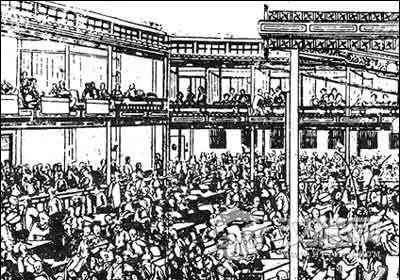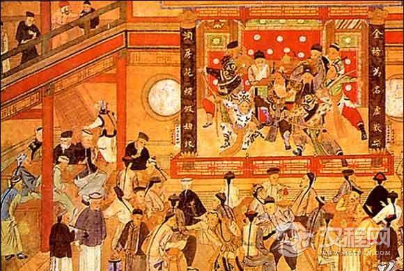 2、唐代戏场:唐代的演出场所大多与佛寺有关系。常见的有歌场、戏场。歌场是表演歌舞的场所。这种场所人们可以随意进去甚至参与表演。戏场指城市中演出百戏杂技歌舞的地方。在一座城市里戏场可以有多处,一般设在寺院里。戏场是皇室到普通市民最喜爱的游艺场所。《隋书音乐志》记载:“每岁正月十五日,于端门外,建国门内,绵延八里,列为戏场。百官起棚夹路,从昏达旦,以纵观之。”