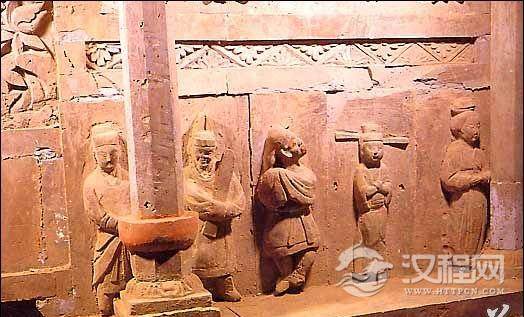 画面正中刻一座重楼,楼底层有5人坐着饮酒,伎人表演则在楼旁边的空地上。