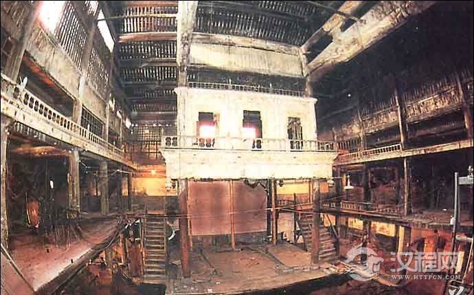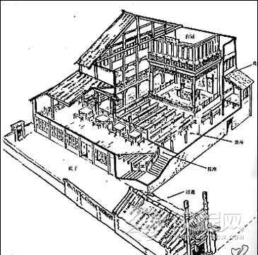戏楼经历了从台到楼,从简陋到精良的发展过程。即露台,舞亭类建筑,舞厅。舞厅的形成标志着三面敞开,一面留作后台的典型的中国式戏楼的确定。