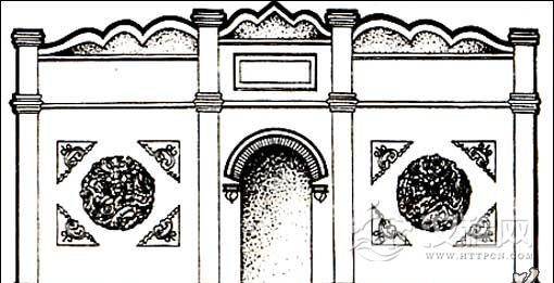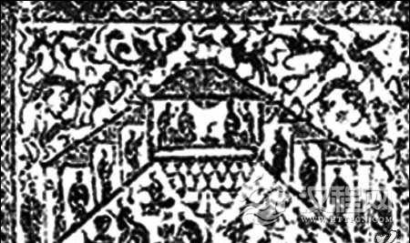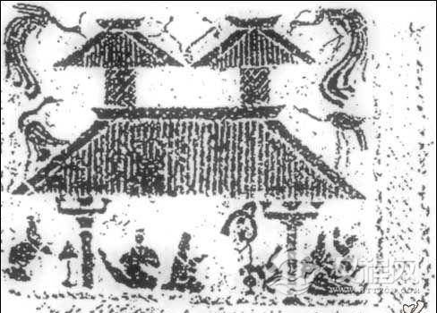 其上刻一厅堂,上方有两个望亭。堂内左侧是二主人坐像,右边为伎人表演。这是最明确的厅堂演出形象。