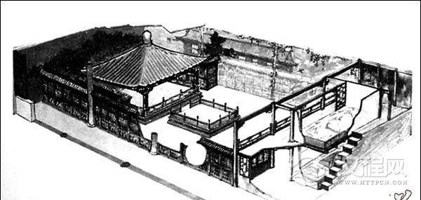 这是一座小庭深院,进深二重,另有回廊和别的院子分开。前院堂屋外有伎人表演,后院廊下有人抚琴,表现了一般地主的家庭娱乐活动。