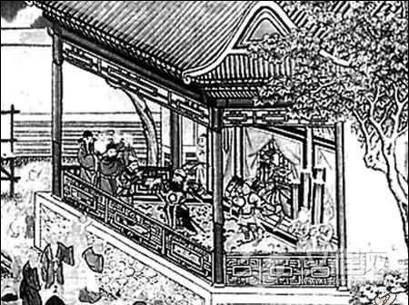 图中右侧有一屋,利用斜侧面构图,屋中主仆都面向庭中观剧。