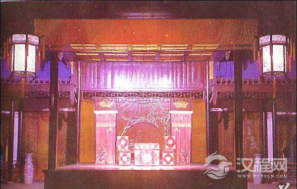在沈阳故宫喜荫堂内,与喜荫堂和两侧厢廊构成封闭式庭院格局。戏台为木结构,前后台以刺绣底幕相间。