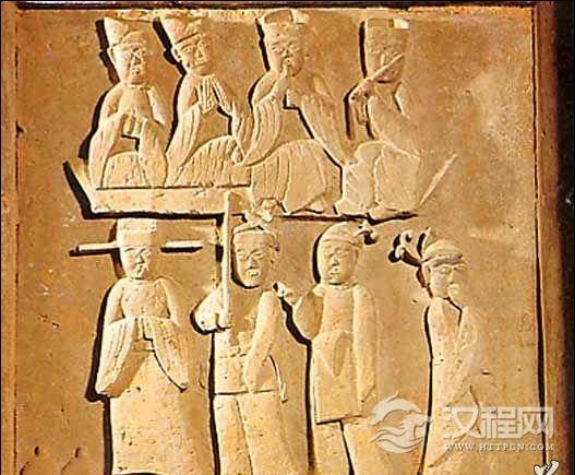刻有五人在屋内席地而坐观看表演。
