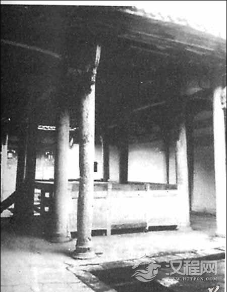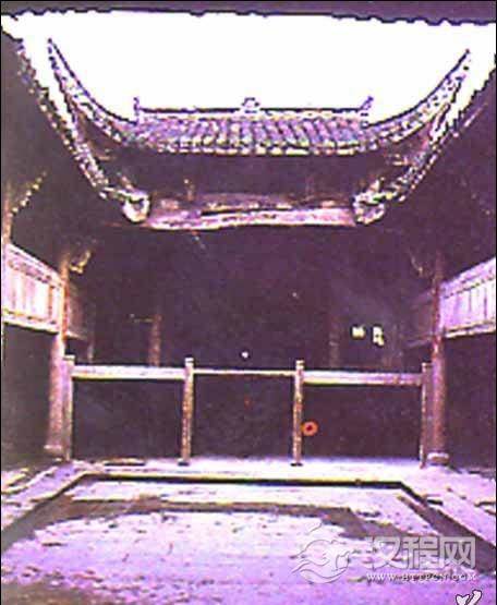 即邵氏宗祠。戏台为长方形,前后都有天井。整个台架有了十二根木柱支撑,其中四周台沿有十根木柱。大门两侧是厢房。