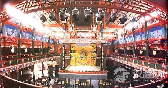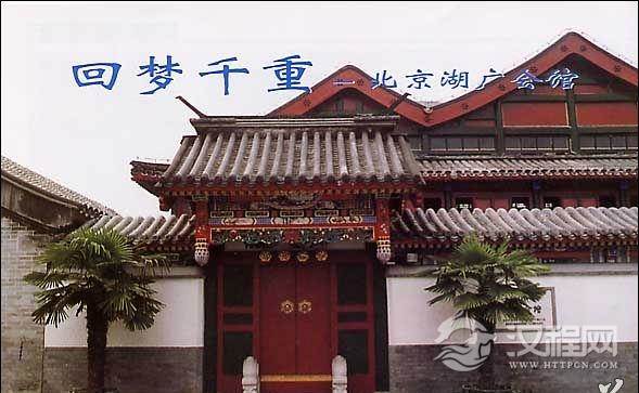 湖广会馆建于清嘉庆十二年,位于虎坊桥西南角。其中戏楼建于道光十年。舞台为方形开放式,正中挂有“霓裳同咏”的匾额,两侧对联是:“魏阙共朝宗,气象万千,宛在洞庭云梦;康衢偕舞蹈,宫商一片,依然白雪阳春。”台沿有矮栏,坐南朝北,台前为露天平地(后改为室内戏楼),三面各有两层看台,可容千人。名伶谭鑫培、图余叔岩曾作为两湖同乡在这里演戏。梅兰芳、图程砚秋等也在这里登台献艺过。现在重修的湖广会馆被开辟为北京戏曲博物馆,大戏楼每晚由北京京剧院的名家进行精彩的表演。成为展示戏曲精品,普及戏曲知识的重要阵地。