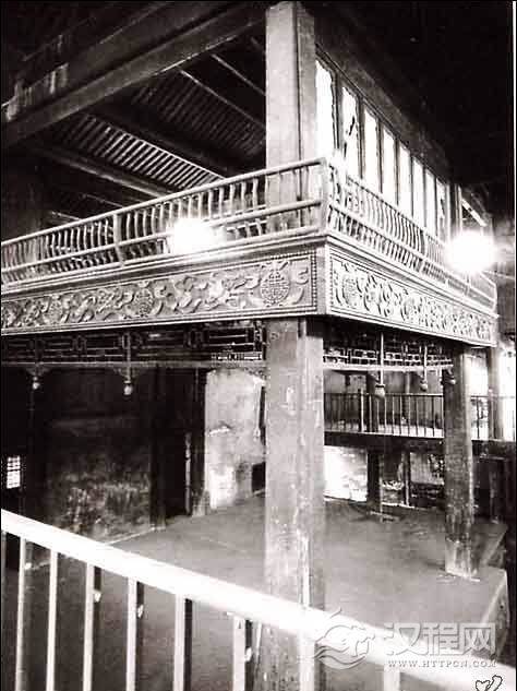戏台为两层砖木结构,背倚祠门。戏台宽大,下层高近八尺,副楼及两厢观剧楼,均有板梯上达。