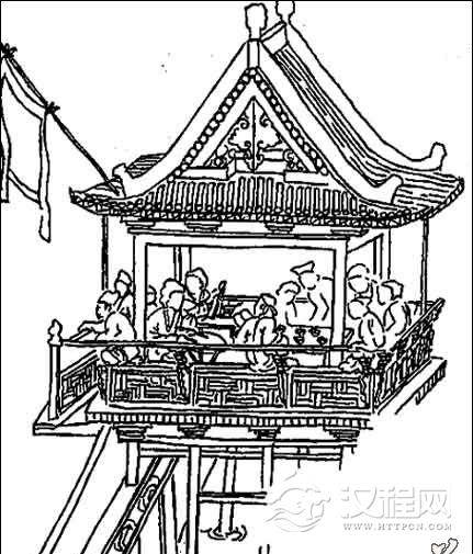刻有多层斗拱楼房,观看者居高临下欣赏楼下场地上艺人的演出。