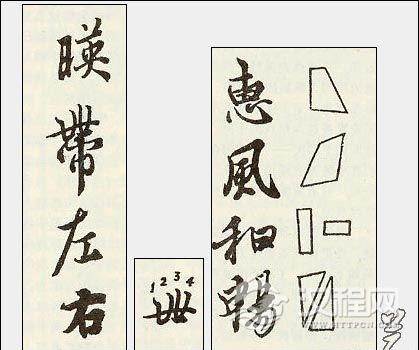 线条的多变则可看“带”字,头部四个竖笔图二)两直两曲,如果把它分成四个由直向曲的层次,则是①直,②次直,④曲,②最曲。绝不生硬板滞。而即便是①的直,在头部也有意使之弯了一下,与其余三直笔协调起来,构成整体效果。从直线到弧线,线形在依次变化,这种变化是以严谨的序列为限制的。我想,作为学书者而言,对于这样的临摹要求,至少应该从几个方面先检验一下自己:A,能不能发现这四根线的不同;B,能否在此中找出变化的规图律即四个层次一——它有内在的联系;C,能否用动作把它 们都准确地表现出来;D,表现的层次是否与原效果基本相似。只有看假了并表现出了这些效果,临摹也才算是有所收获的。