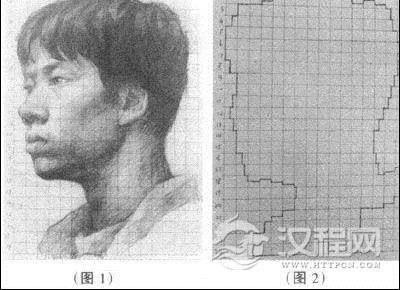 2.临制轮廓:在素描纸上按选好的构图范围用直尺划出与范画上相等数量的方格。分别在水平线和垂线上注明坐标。然后根据范画的形象轮廓线在方格里的座标走向,临制到素描纸上相应方格内。最后进行整体轮廓线的调整,尽量做到基本形的准确(图2)。
