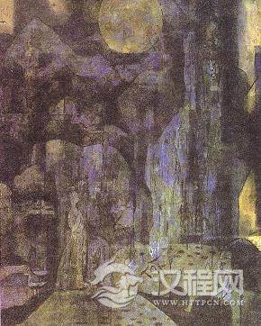 我在人物画创作的探索中,常常根据自己的思考进行一些多方面的尝试,《春江花月夜诗意》(见右图)便是我以唐诗诗意为题材创作的十幅作品中的一幅。古代诗意组画曾于2000年以“唐韵”为题在法国展出