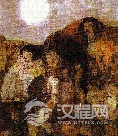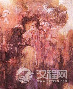 此图的立意追求平静、温柔、纯情的韵味,因此选择了温馨的绿调子。技巧处理上用了平直、流畅的线条。大片的黑色形成不同形状的对比,根据构图的需要用赭色铺底色,再在衣裙等处上绿色,使颜色在人物的衣裙和鸟、花等处形成一定的肌理。有些需要留白 的地方一定不要弄脏、腻死,这就是我们常说的要透气。然后,再作进一步的调整,用暖调的赭石水色泼染,色墨相撞又出现更丰富的效果。如此反复,就营造出画面既厚重、清雅又温馨、浪漫的气韵了。